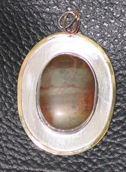 Hand cut stone set in fine textured Sterling Silver with brass edging.
